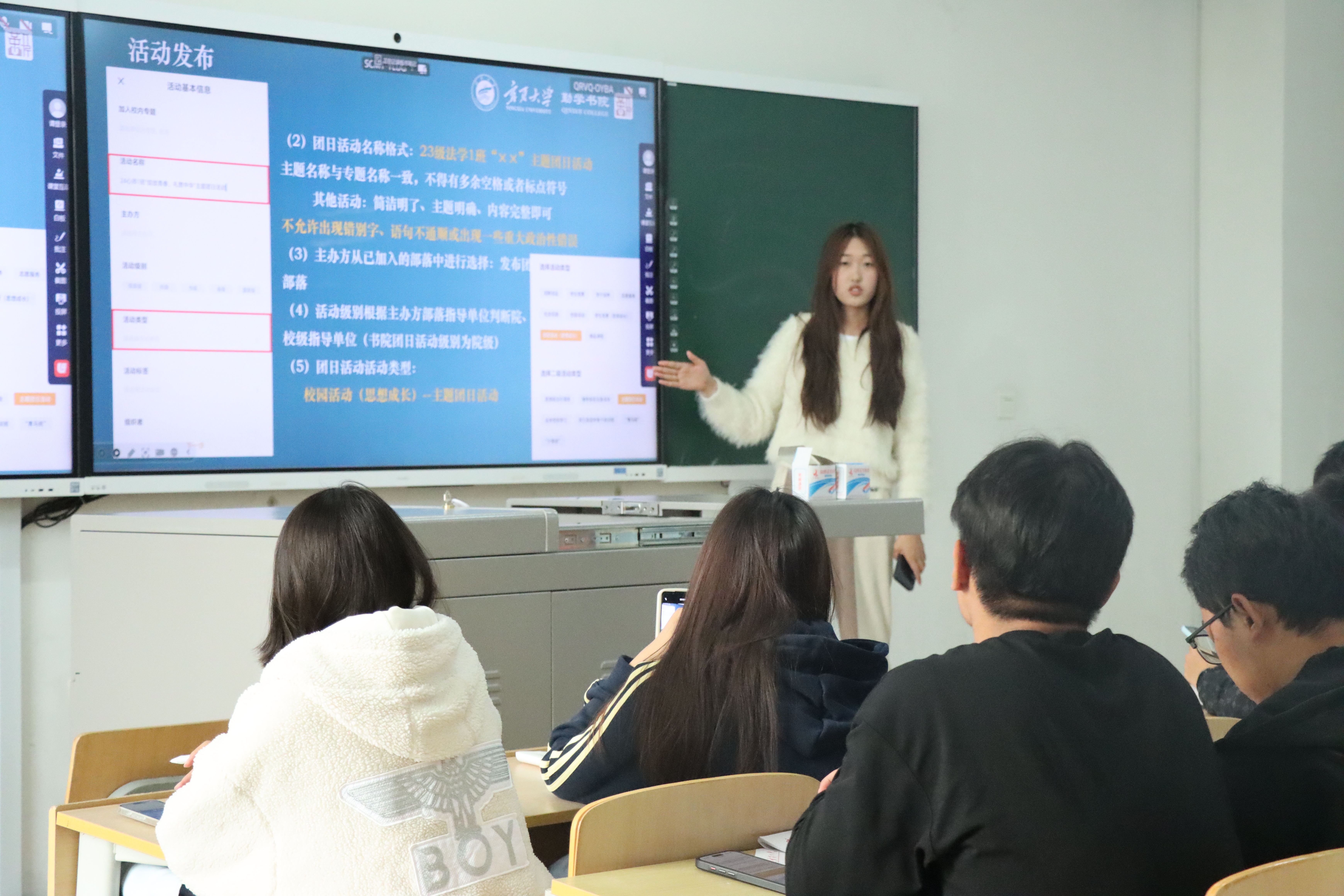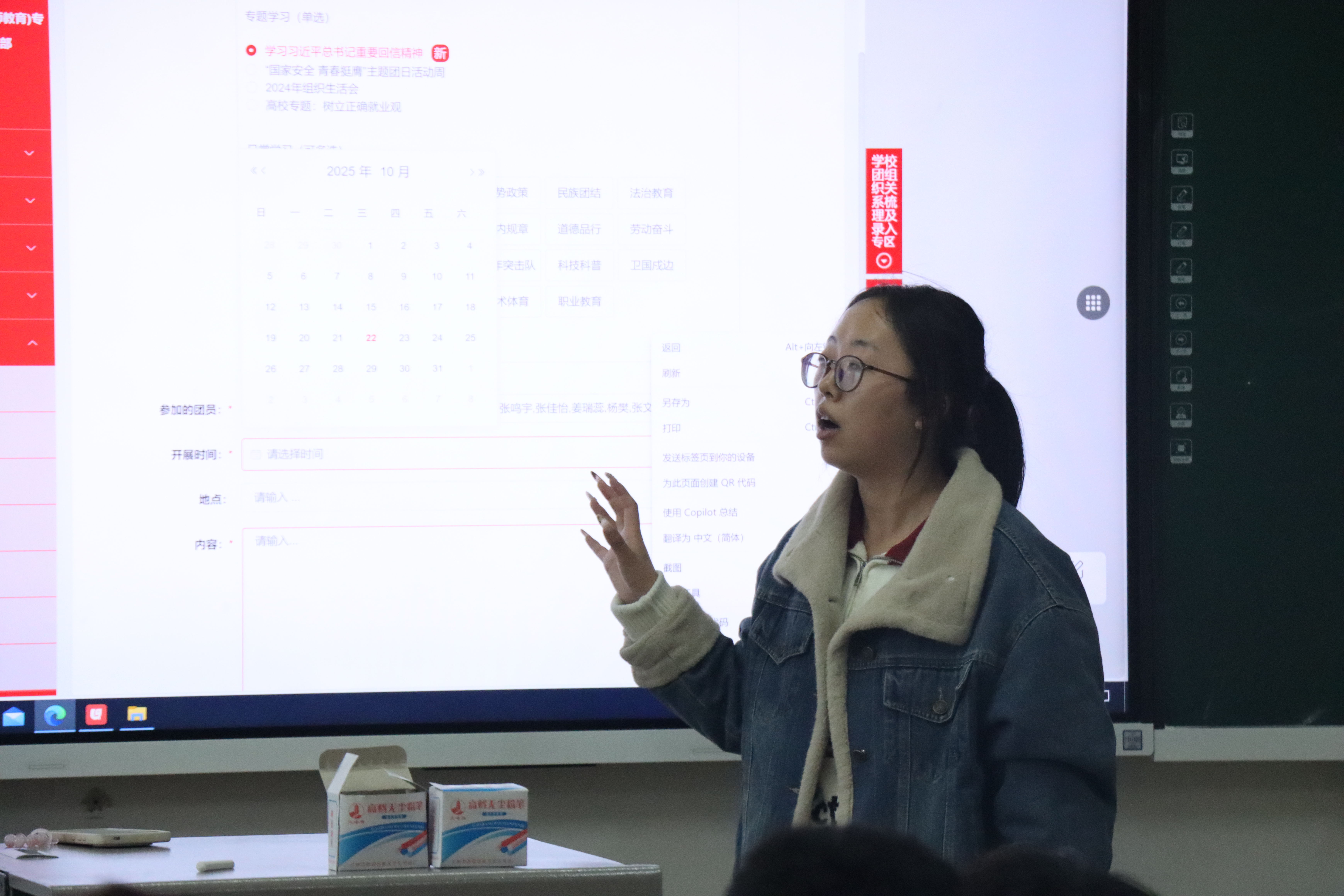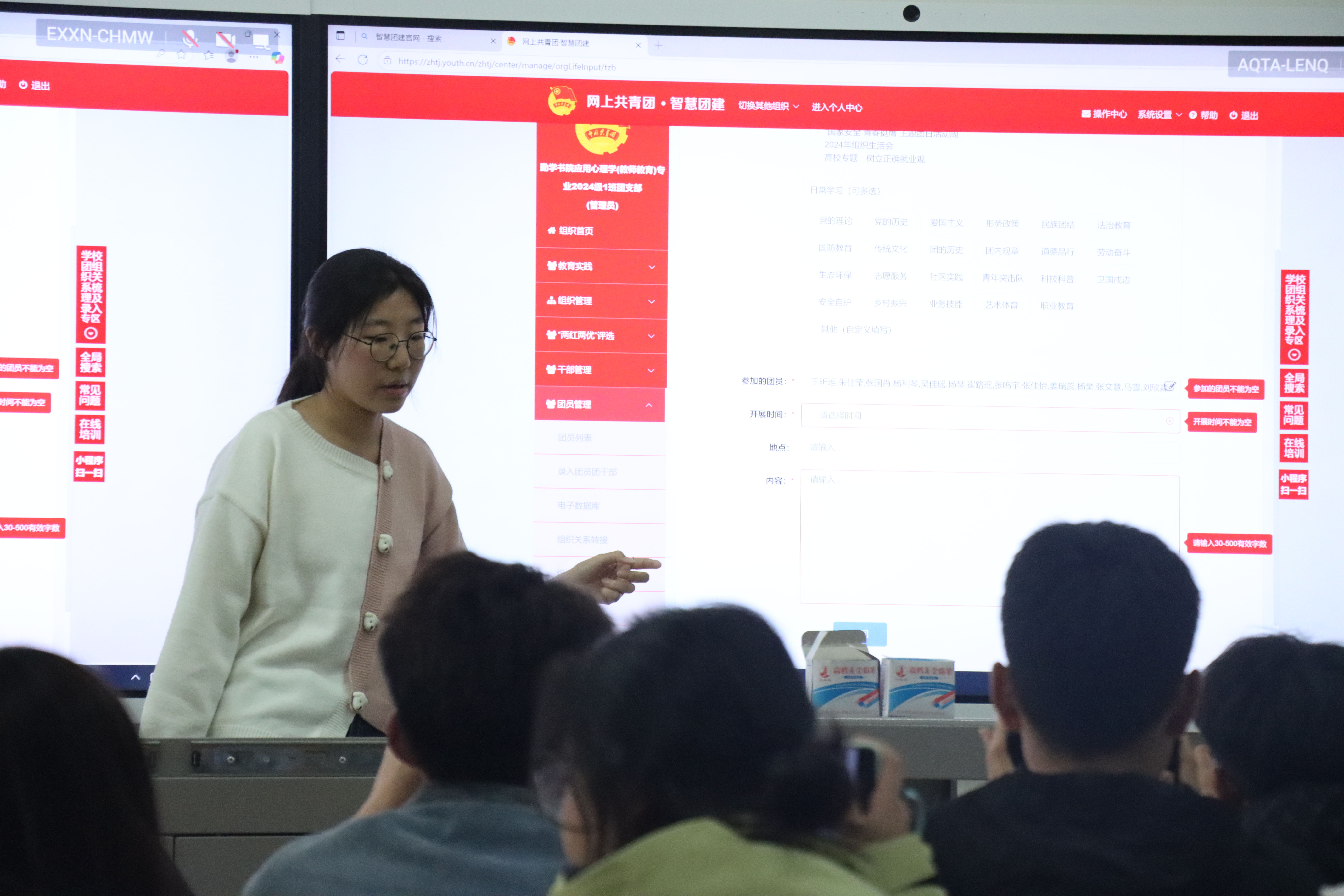 随后,团委二课服务部和组织部负责人向同学们讲授了第二课堂平台操作流程并分享了近期理论学习热点。马晓凤现场演示了智慧团建主题教育实践操作流程,并逐一细化了团支部书记后续工作的注意事项。