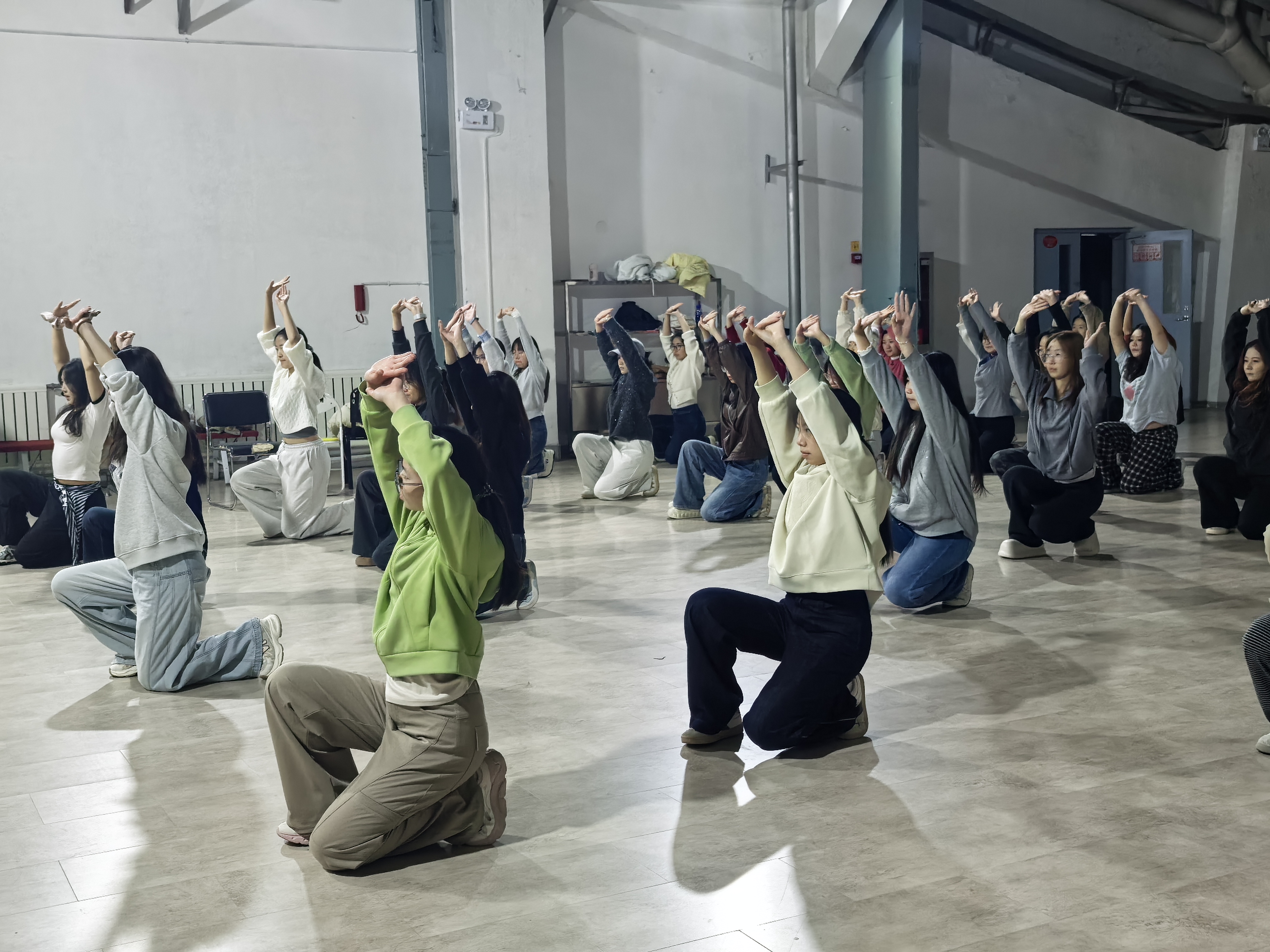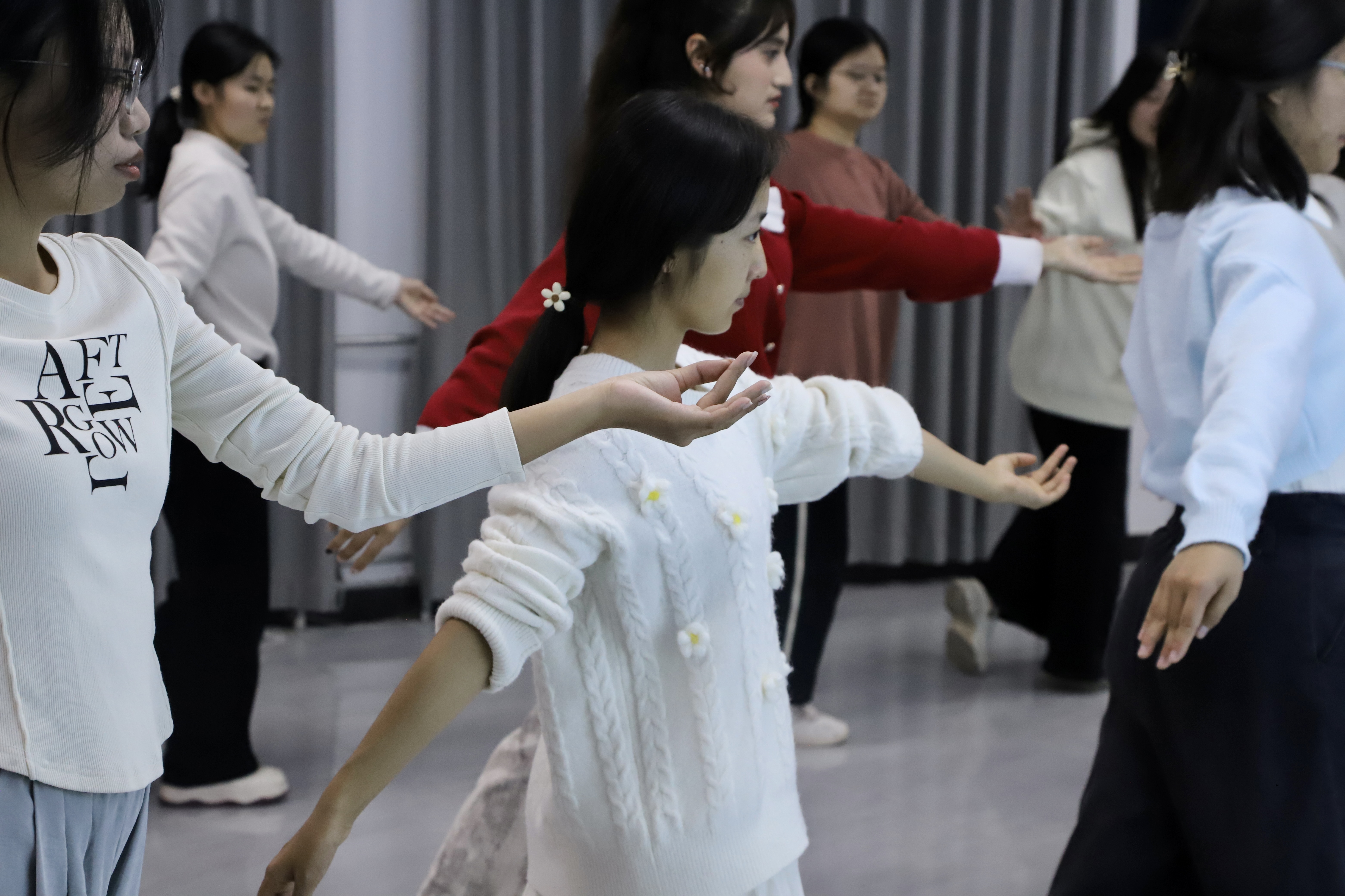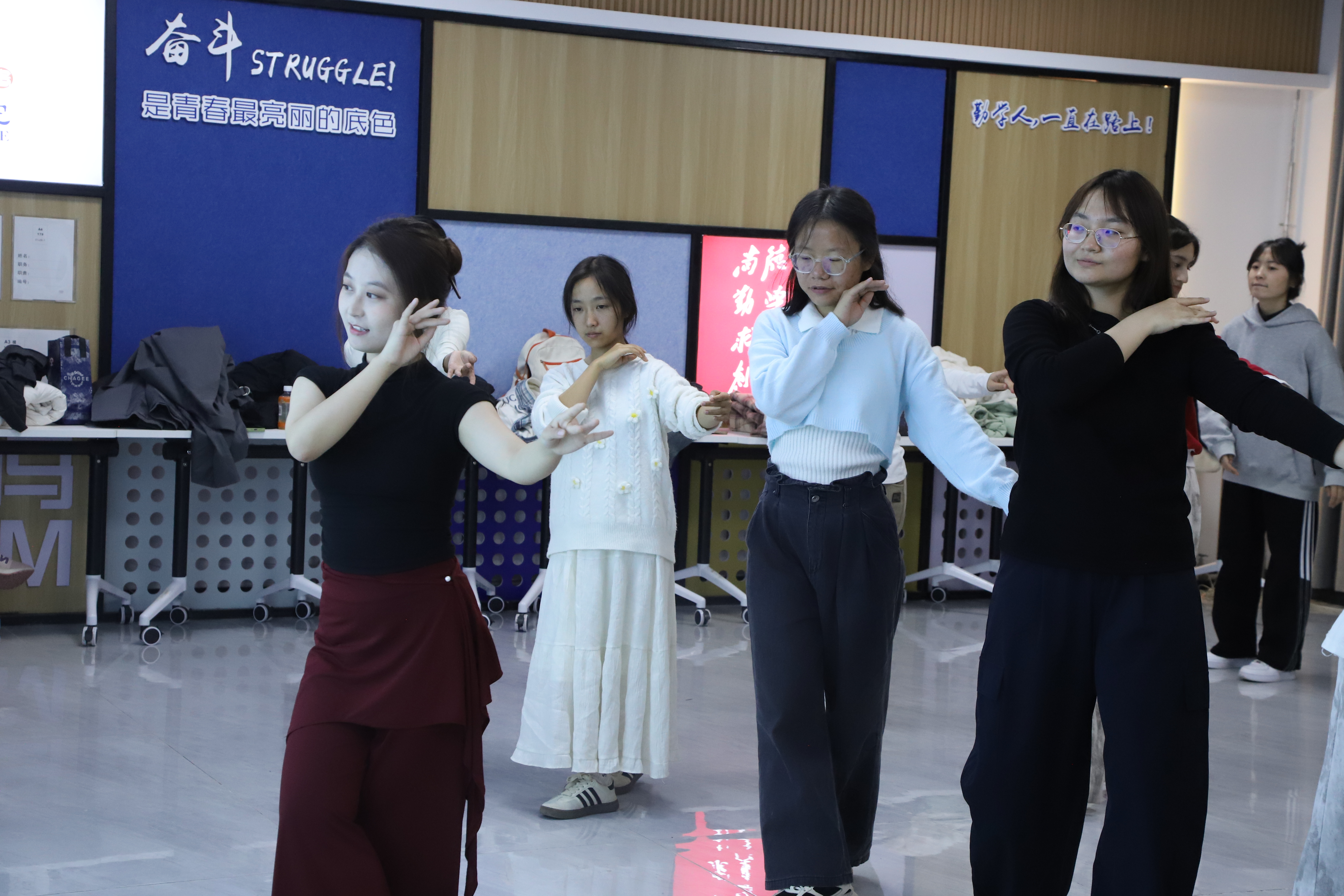 古典舞的环节,是一场通往内心的深度对话。伴随着悠扬的乐声,一抬手、一低眉,行云流水间,是将纷繁心绪细细梳理、轻轻安放的过程。同学们跟随着韵律,将紧绷的神经一寸寸松弛,将积压的焦虑一点点吐纳。在这里,舞蹈不再是动作,而是一种语言,教会我们如何与内心的情绪温柔共存,达成一场与自我的深刻和解。