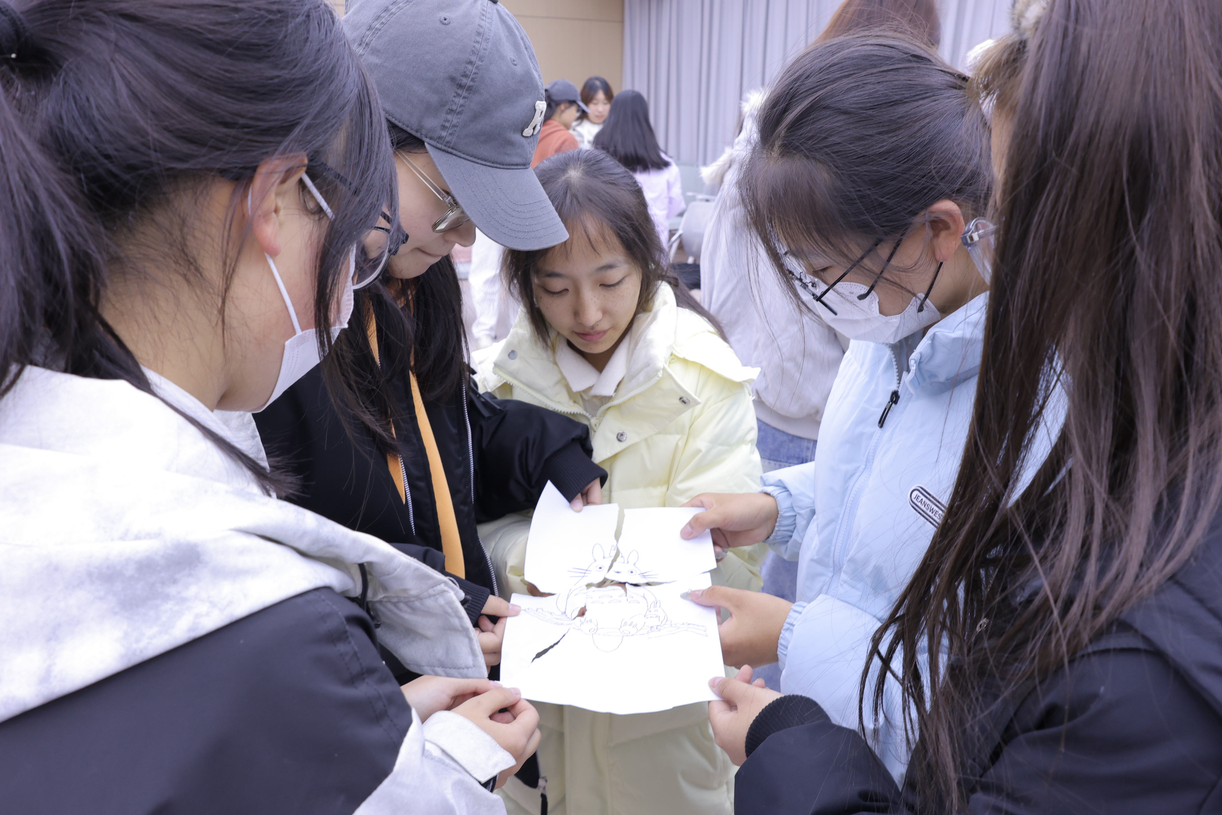 告别独处的静谧,同学们围坐一堂,趣味游戏成了最动听的开场白。活动现场,大家三人一组、五人一队,参与拼图流转游戏时,握着印着哆啦A梦、懒羊羊的卡片互相配合,碎片拼合的瞬间,陌生感渐渐消散;听歌识曲·抢抱枕环节里,熟悉的旋律响起,大家争相冲向云朵抱枕,怀抱战利品的欢呼与未抢到的雀跃交织,《Always Online》的节奏让欢笑传遍全场;词语串烧时,“拖鞋怪拯救地球”“火锅味霸道总裁”的奇思妙想不断涌现,冰冷的词汇在协作中绽放趣味。一次配合,一次击掌;一声欢呼,一声心跳——距离被揉成团,轻轻一抛,落进彼此的口袋。