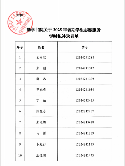 附件:勤学书院关于2025年暑期学生志愿服务学时拟补录名单